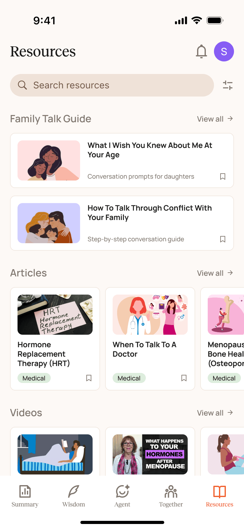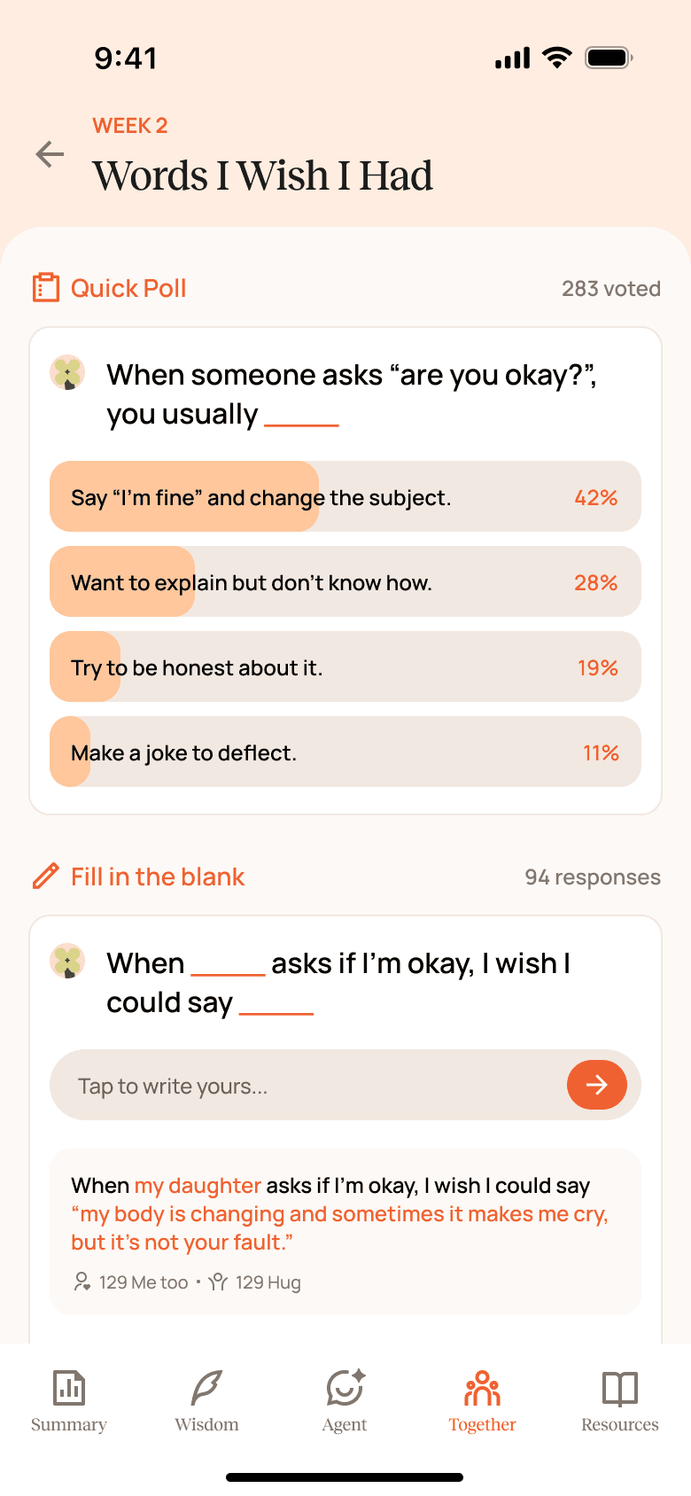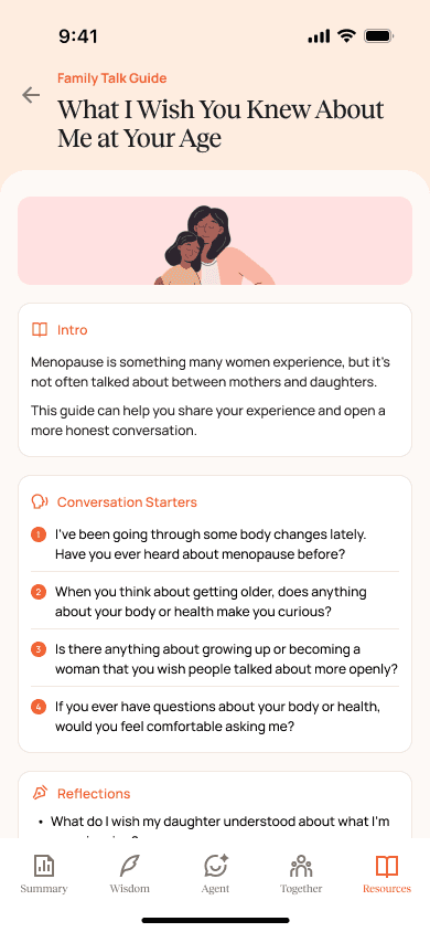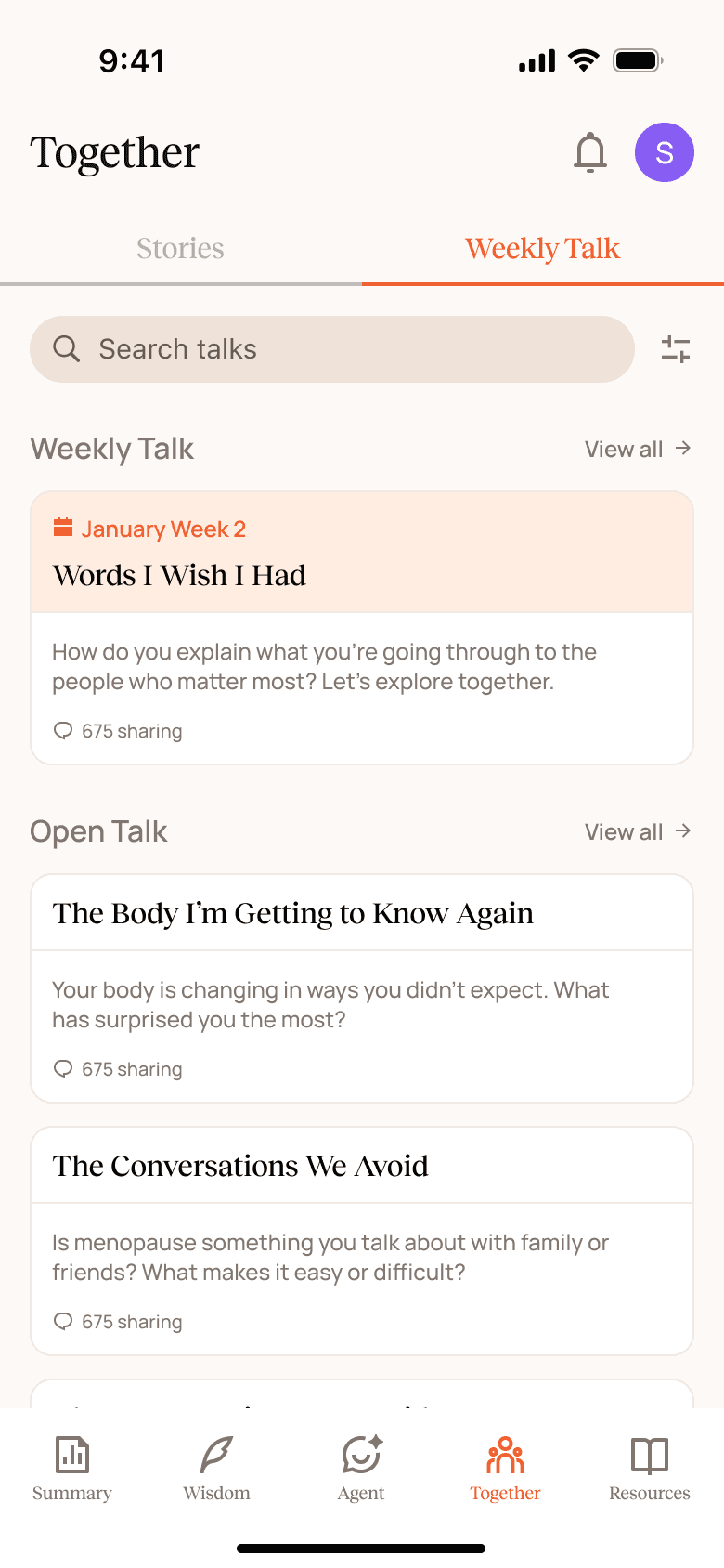 Together is a community space where users can share stories, participate in weekly conversations, and see how others are navigating menopause.