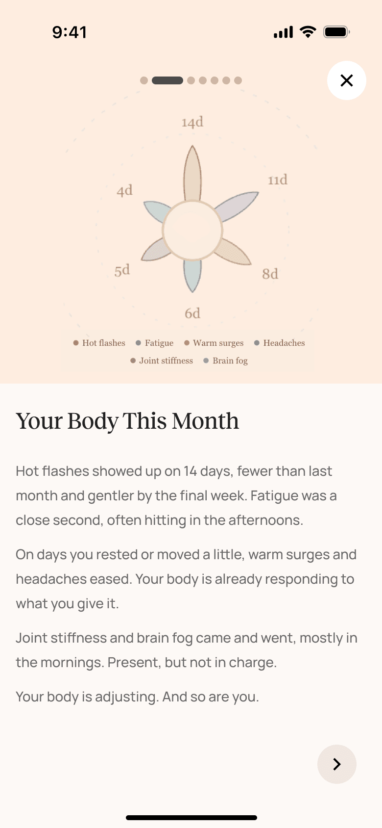 Clover summarizes the user’s monthly symptom patterns, offers personalized guidance, and connects them to helpful resources and shared experiences from the community.
