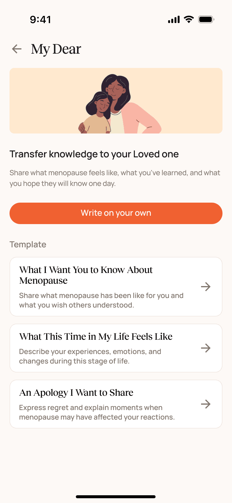 Guided letter templates support users in sharing menopause experiences and emotions with close family members, such as children or spouses.