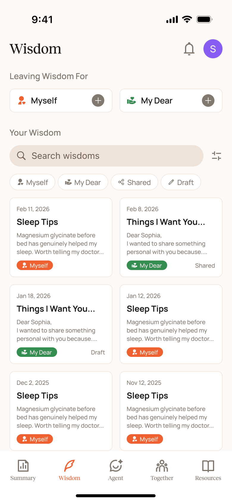 In Wisdom, users can capture personal reflections and turn them into messages that help loved ones better understand their experience.