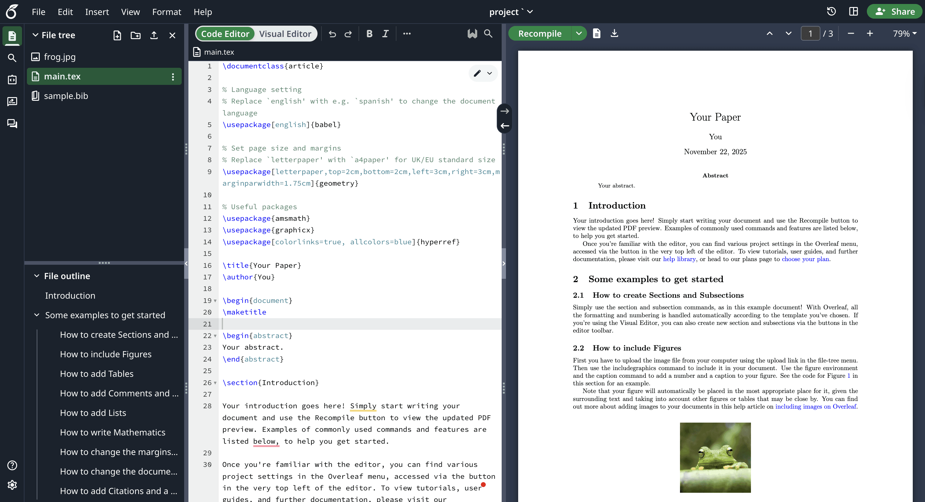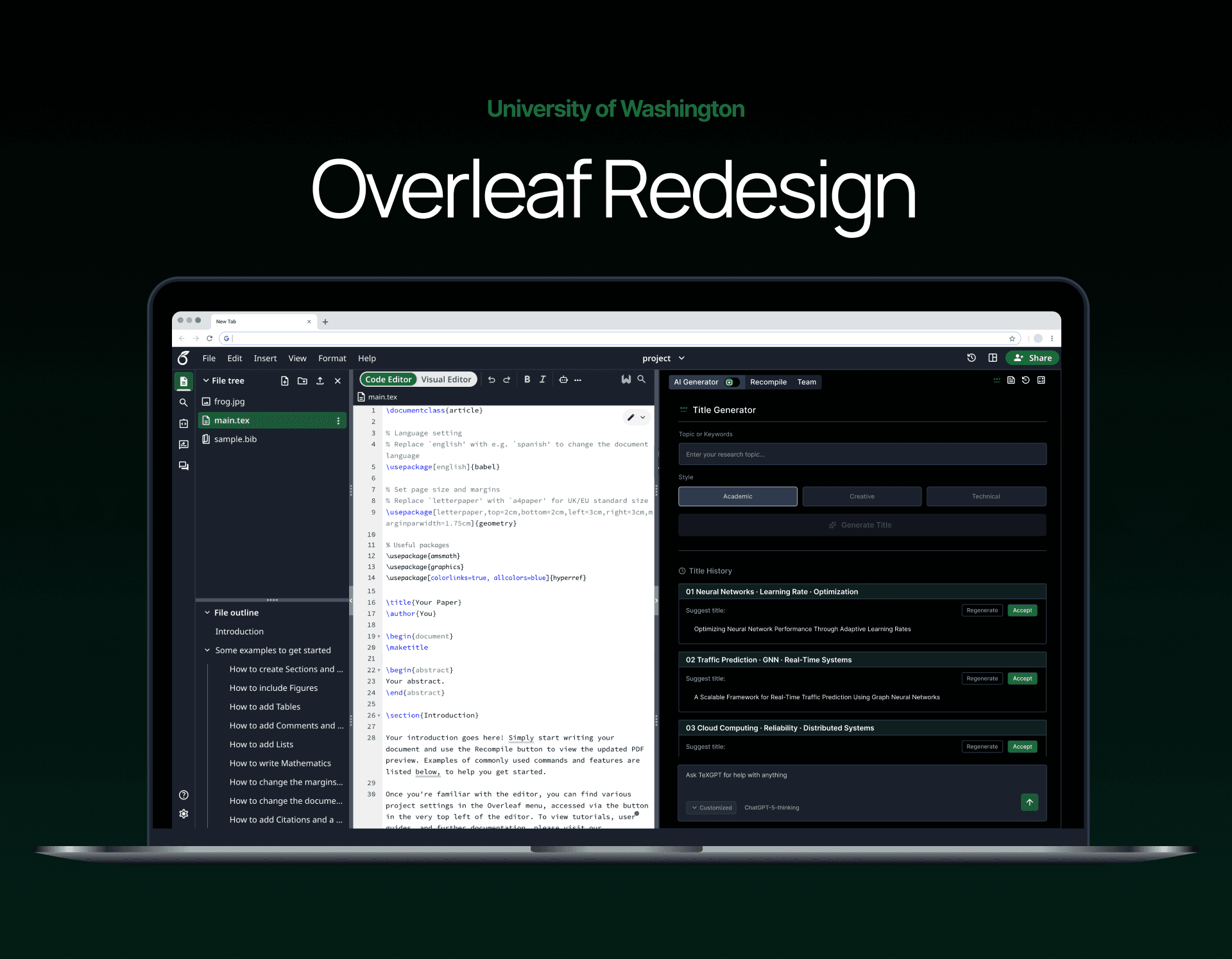 Overleaf is a browser-based LaTeX (code) editor for writing academic and technical documents online.