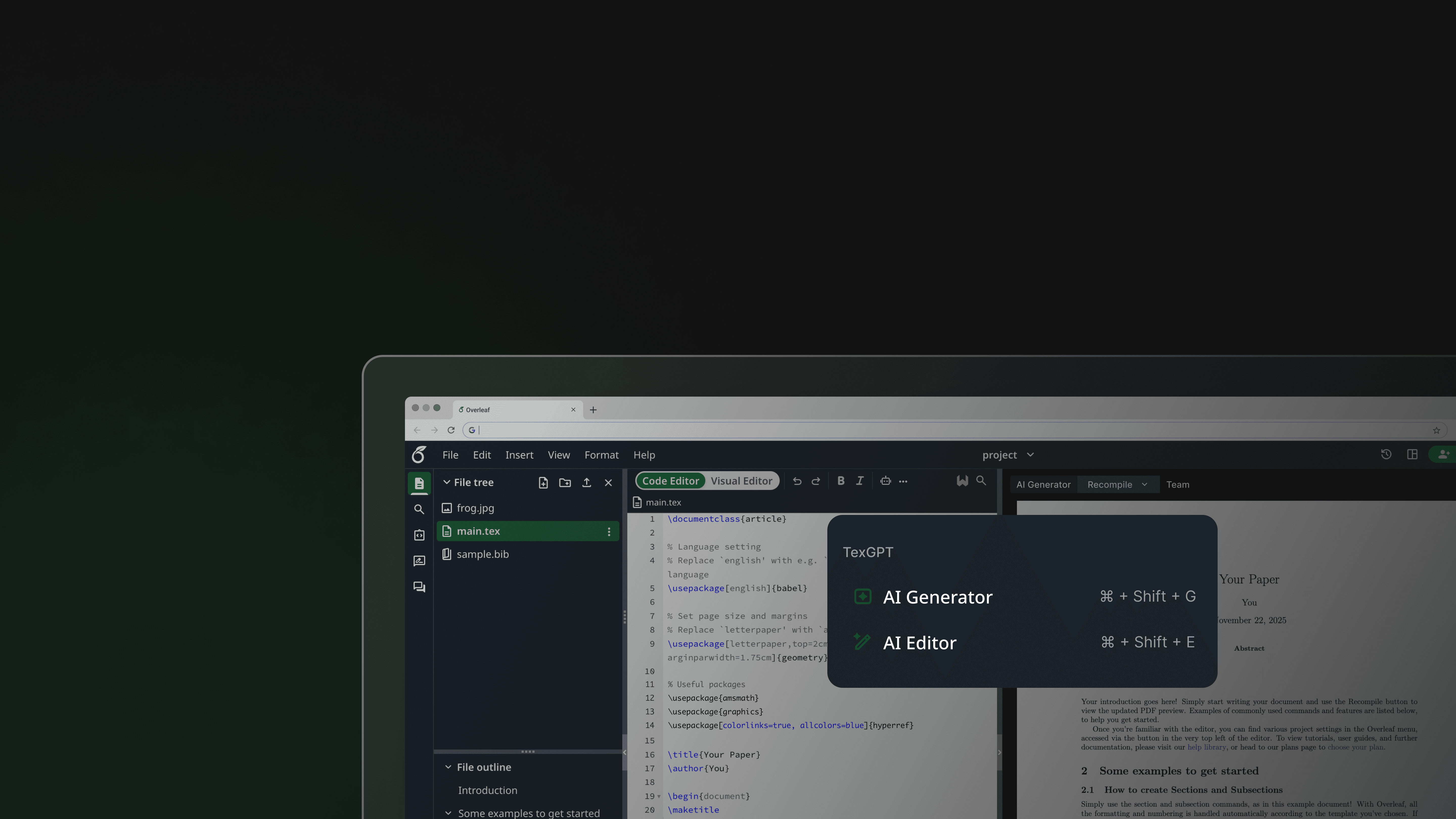 The redesigned Overleaf redefines the existing AI entry point by consolidating scattered AI buttons, making the AI features more glanceable and accessible by allowing users to discover more easily.