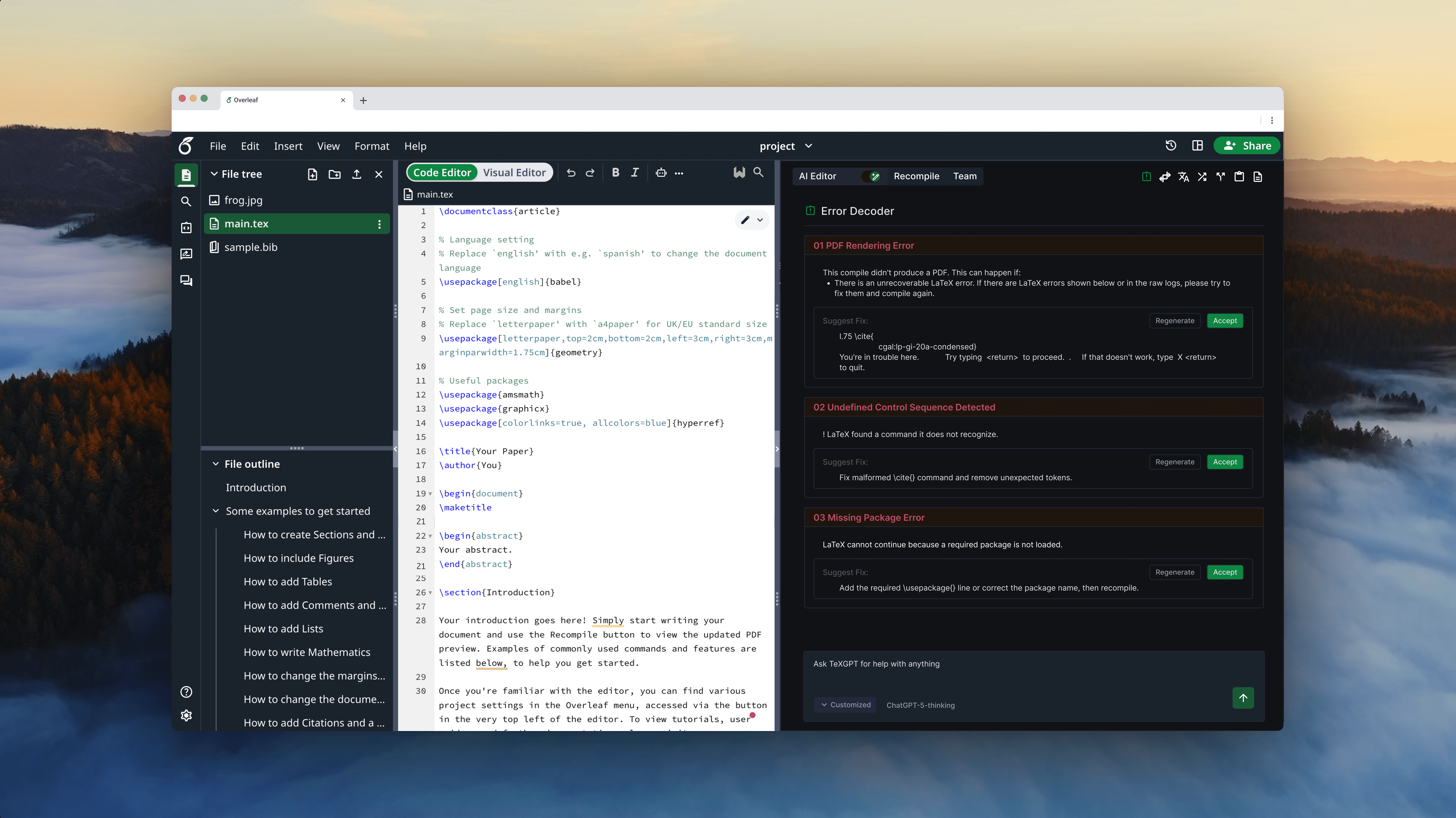 Overleaf is a browser-based LaTeX (code) editor for academic and technical documents.
