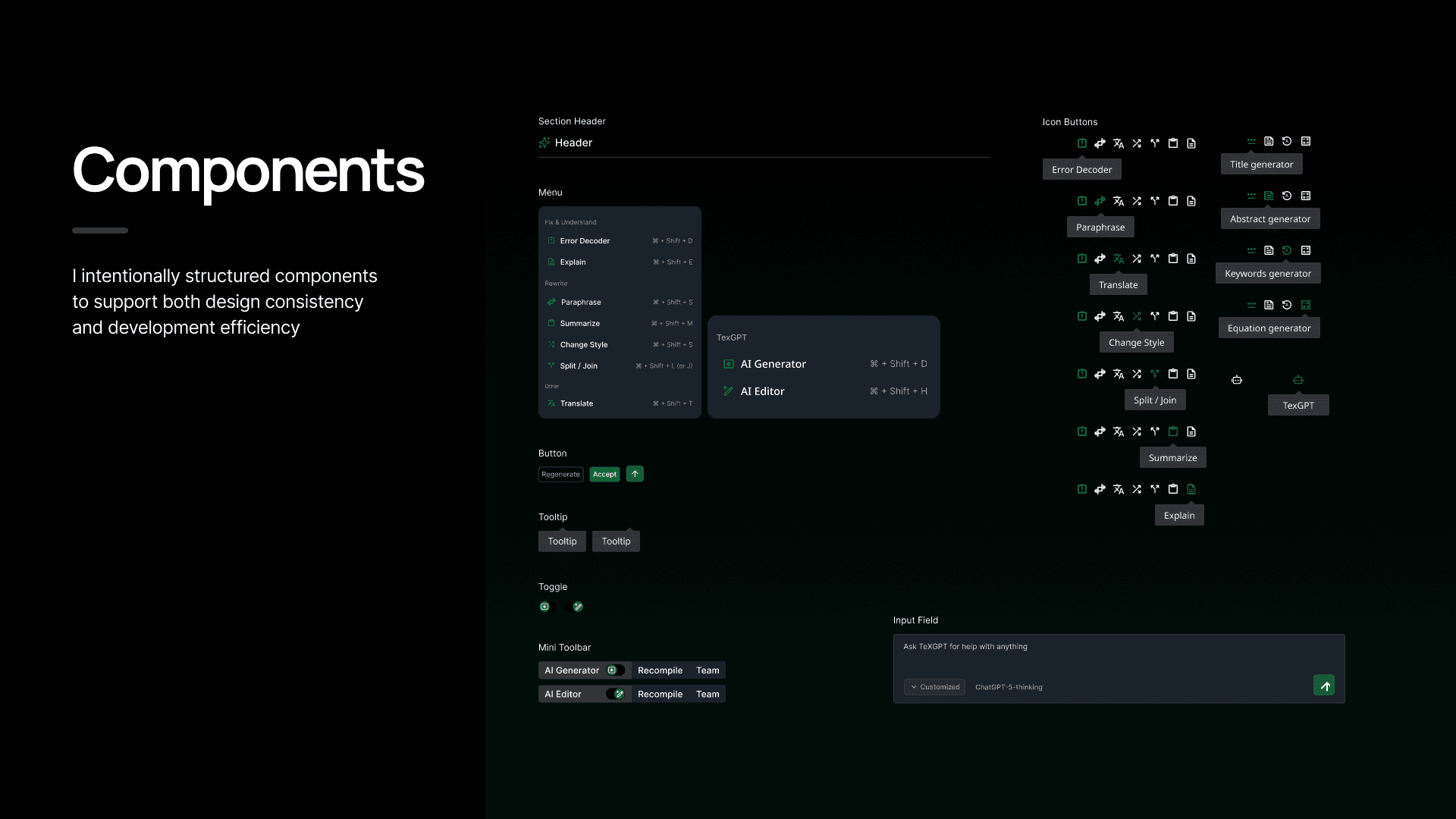 Working on the Overleaf redesign pushed me to rethink how AI fits into complex academic writing workflows. I realized that users weren’t overwhelmed by AI itself, but by fragmented entry points that increased cognitive load. By restructuring AI interactions around document-level and highlight-level tasks, I focused on reducing friction and aligning AI with real writing behaviors. This project strengthened my approach to designing AI tools that prioritize clarity, restraint, and sustained focus over feature expansion.