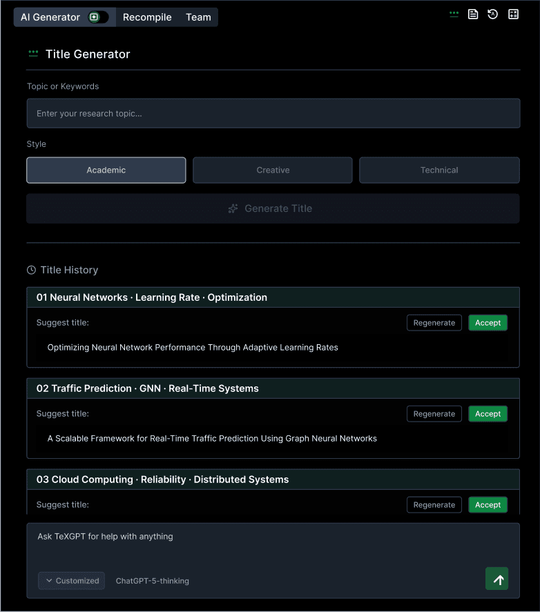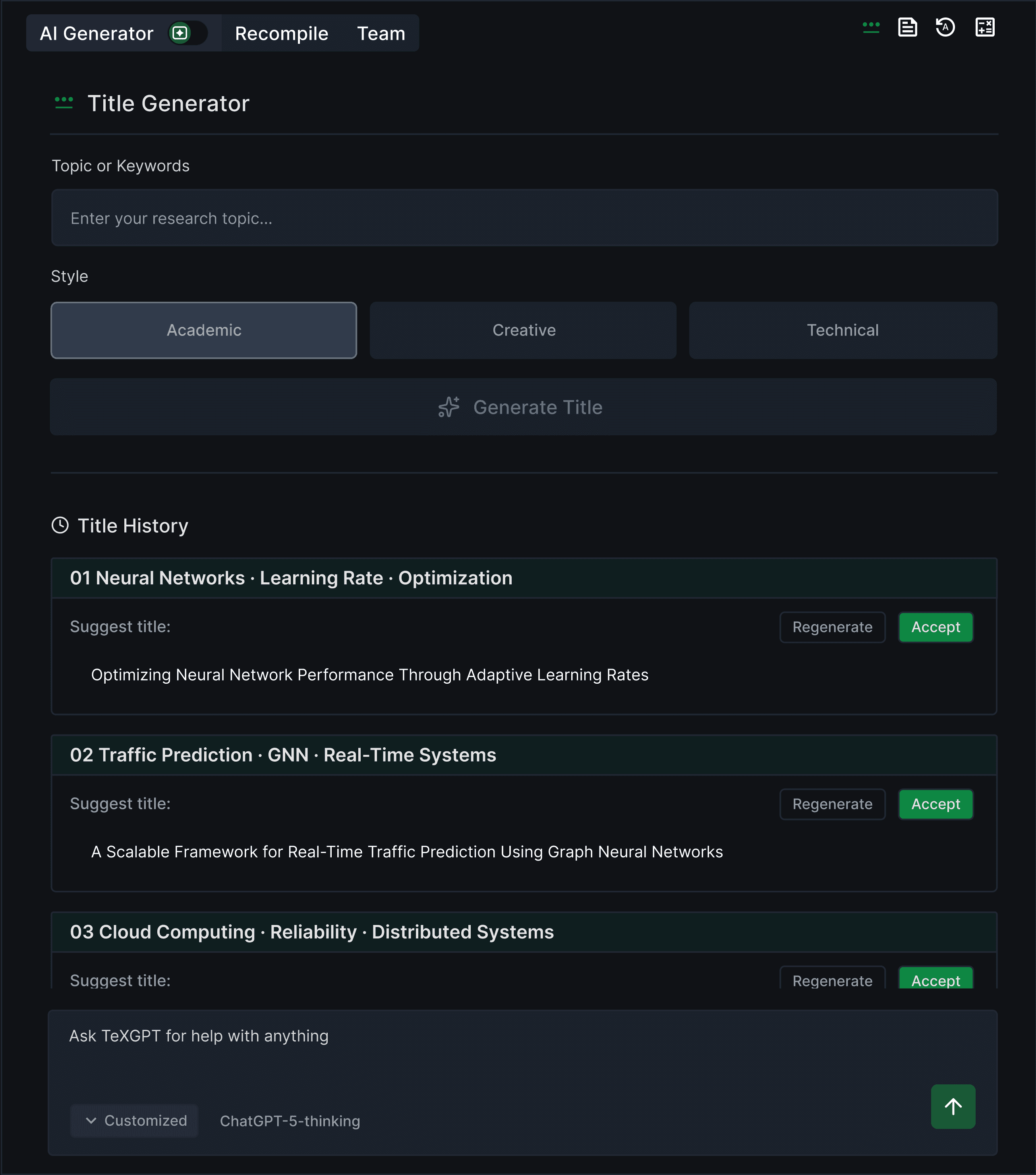 AI features that generate new content, including title, abstract, keyword, and equation generators