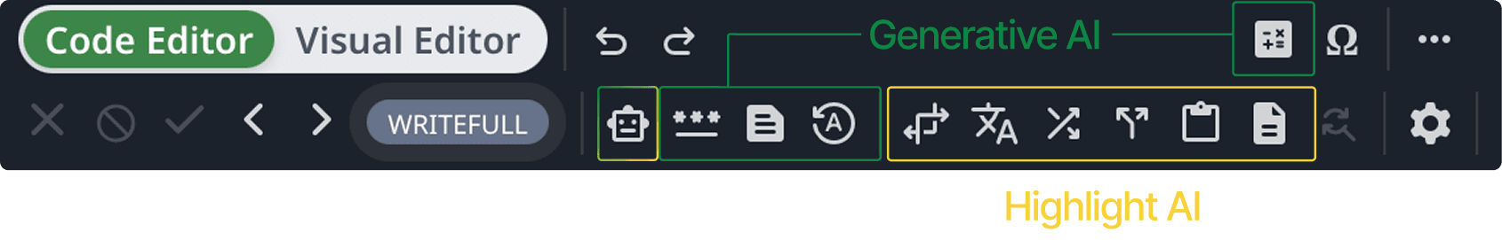 The robot button lets users choose between Generative AI and the AI Editor, reducing confusion caused by multiple features being mapped to a single button.