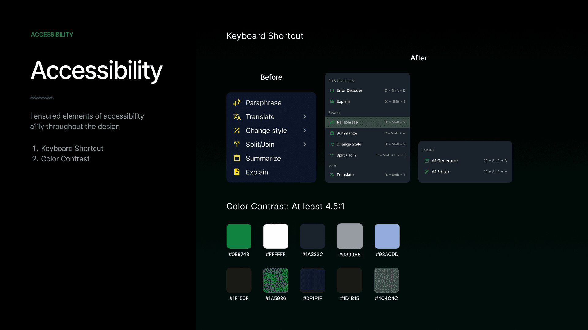 I switched the overall UI to dark mode to reduce eye strain and to visually distinguish the panel as the dedicated space for AI features.